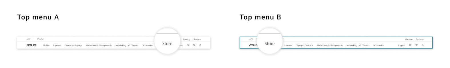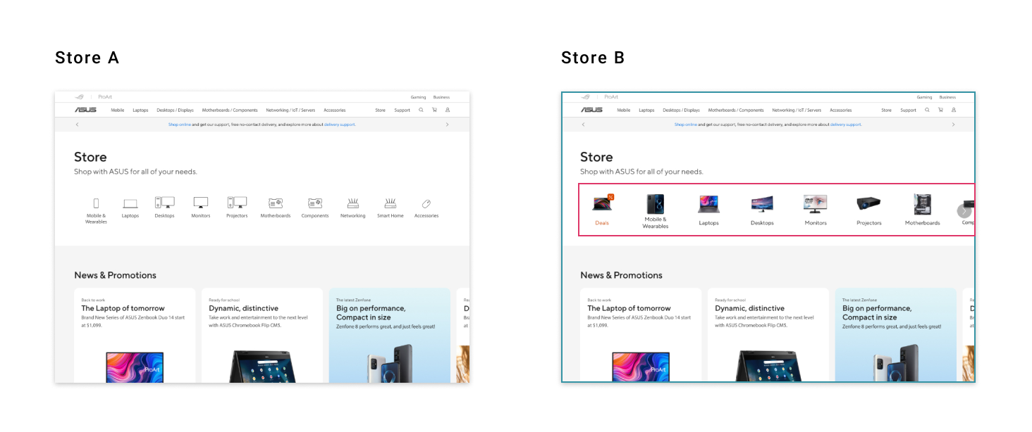 Regarding the product line tab style, although the white icons are more aesthetically pleasing form a design standpoint, we believe that the design B of color icons are more intuitive. On top of that, due to the fact that ASUS has multiple product lines, we arrange the most important ones in front, and design it as a slide row so user could scroll left to view more instead of occupying too much space.