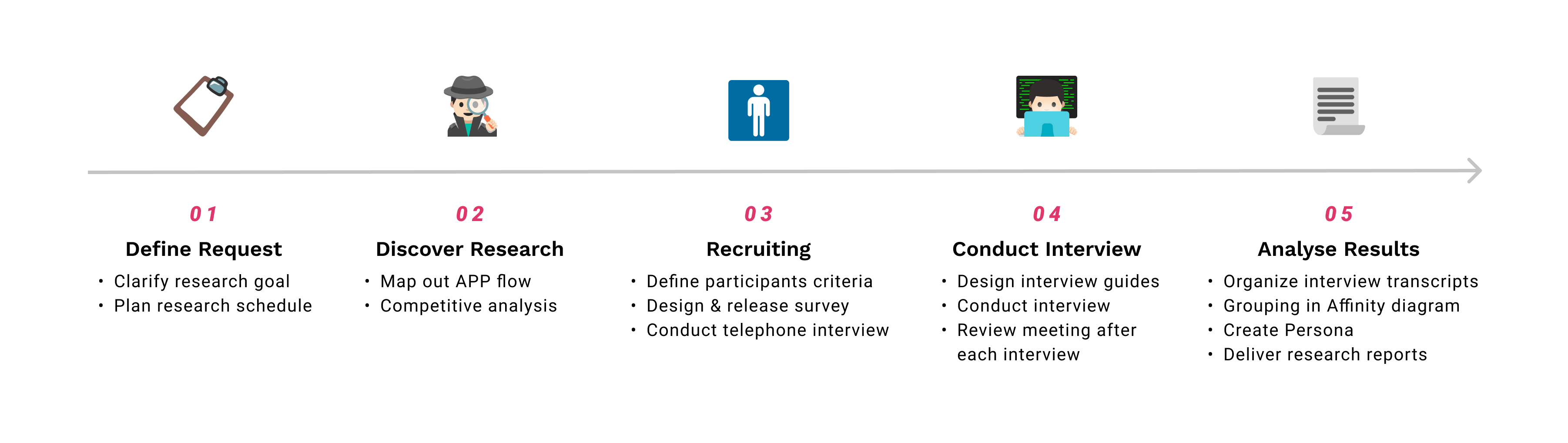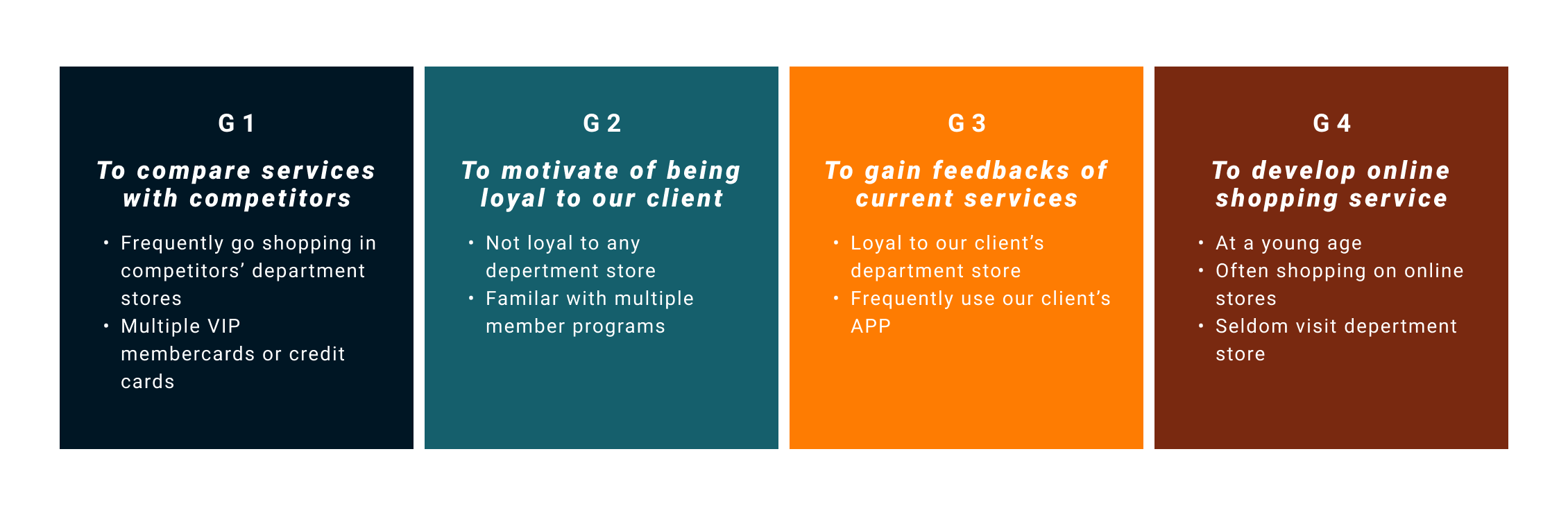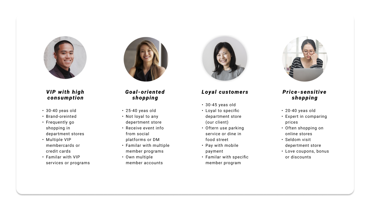 We had segmented four types of interviewees we would like to recruit, and with each type, there's different research goal according to their properties. We released a quick survey to recruit from the public and also from our client's members. After receiving 300+ respondents, we selected suitable interviewees by their shopping frequency, expense, member tier and experiences using department store APP in order to fit our research goal. Next, we conducted telephone interview to confirm their real experiences, occupation and oral expression capability.