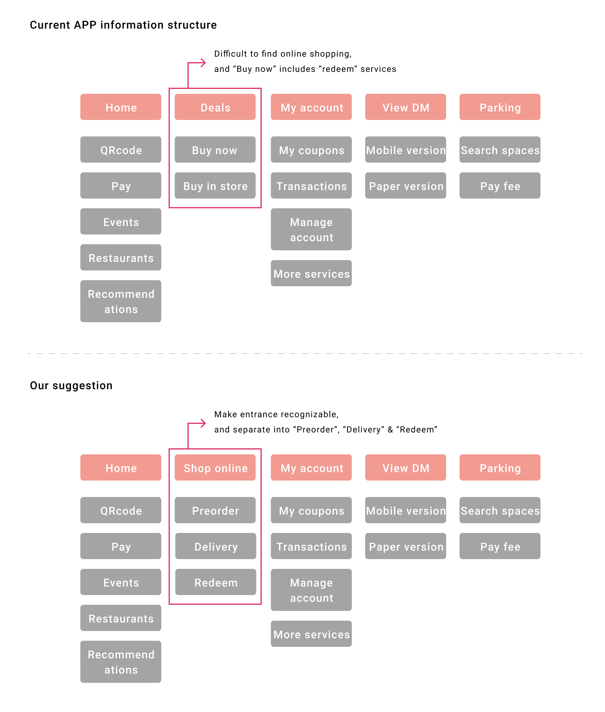 Based on the hypothesis, we had suggested a change in APP's current information structure. From Business perspective, our client wants to develop online shopping but it's difficult to be found, which is hidden behind lots of promotions, deals, redeems, etc. For customers, they actually care most of "Redeem" that they need to know how many points and coupons they have and what they can exchange to.