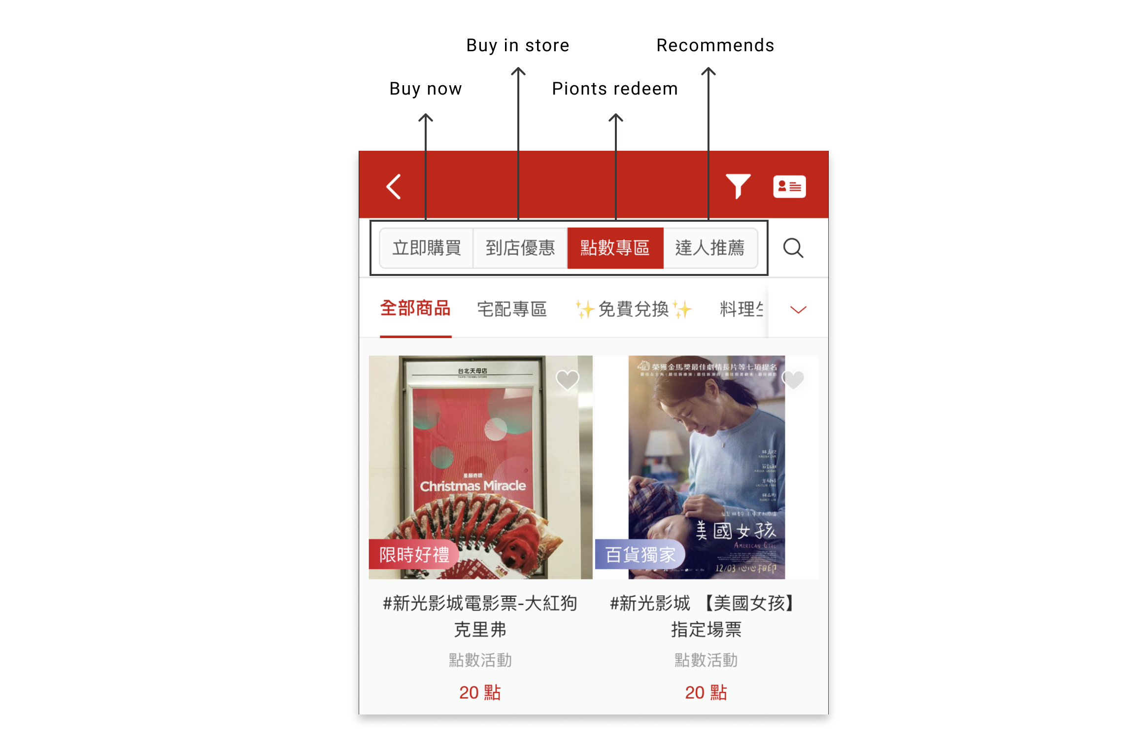 After the project has ended for one year, I found out that our client actually did implement our second suggestion. "Points redeem" is separated as an independent category!