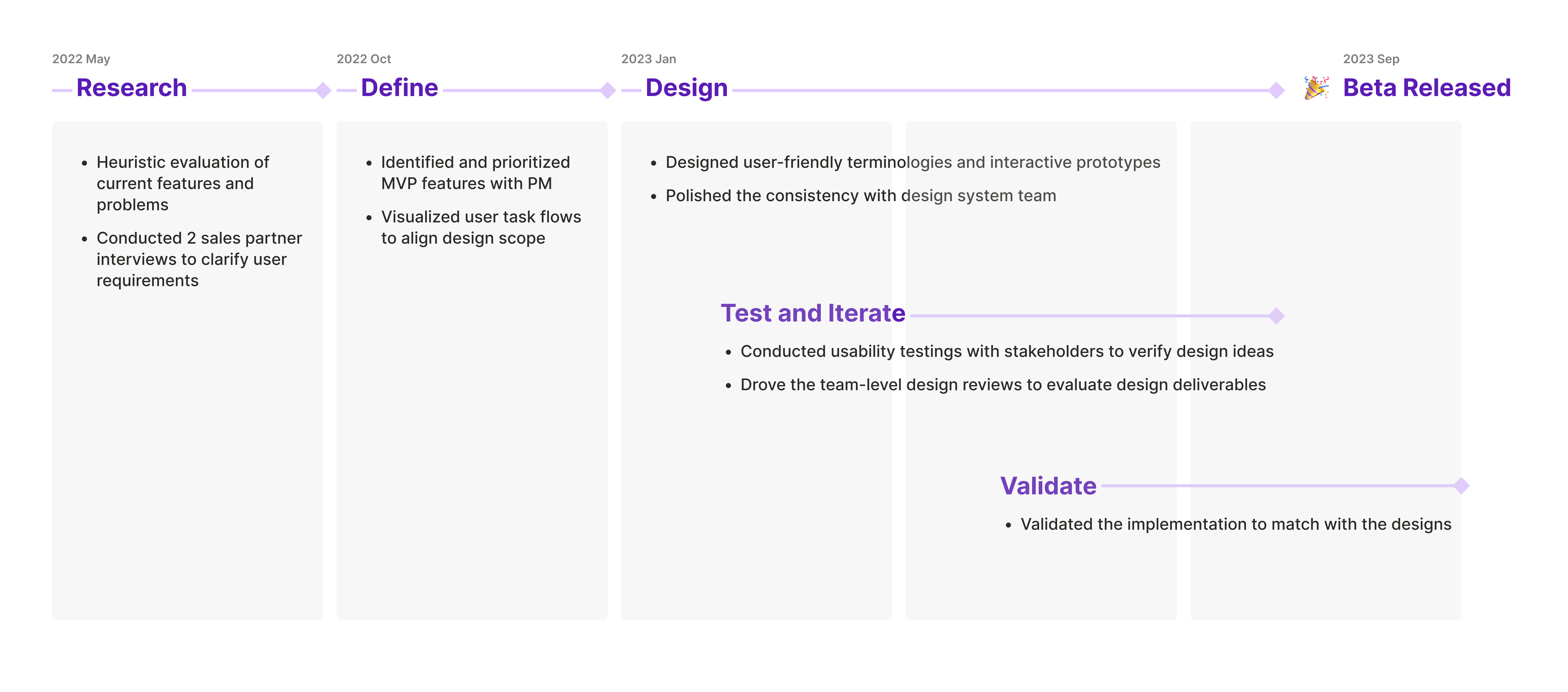 During the design stage, I iterated the designs based on the feedback we received from design review and beta release, and we also consider the project timeline, development resources, and technical limitations.